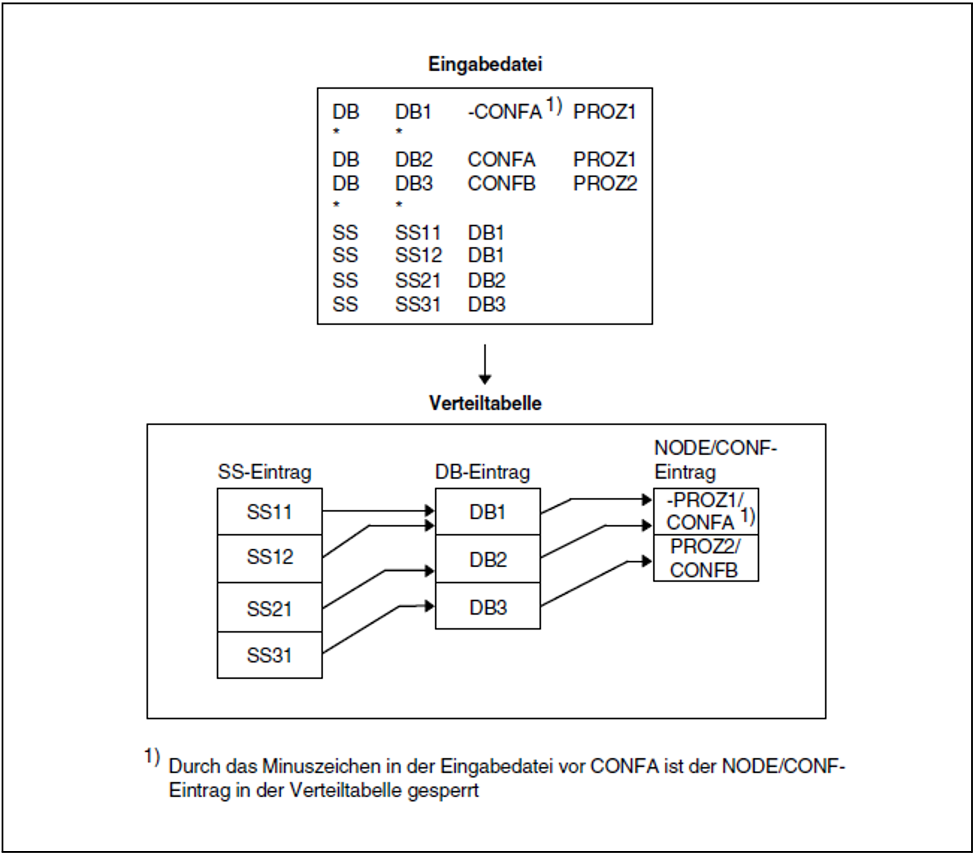 Die Pfeile in der Verteiltabelle verweisen vom SS-Eintrag auf den dazugehörigen DB-Eintrag und vom DB-Eintrag auf den dazugehörigen NODE/CONF-Eintrag. Nur wenn die Kette SS-Eintrag - DB-Eintrag - NODE/CONF-Eintrag vollständig ist, kann die Verteilkomponente in der Anwendertask eine DML-Anweisung an das gewünschte Subschema einer entfernten Konfiguration senden. Andernfalls erhält das Anwenderprogramm den Statuscode 141: „Ungültige Subschemadefinition“.