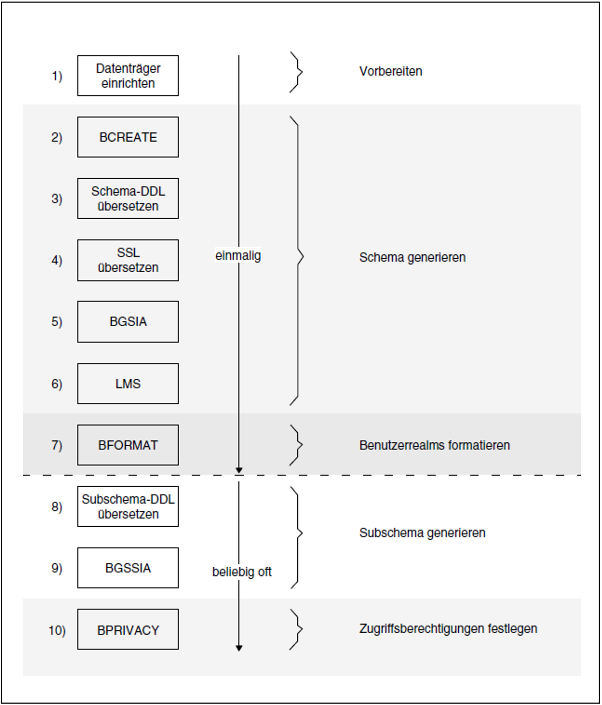 7. | Das Dienstprogramm BFORMAT formatiert die Benutzerrealms der Datenbank mit den Informationen, die im DBDIR gespeichert sind. Anschließend stehen die Daten in der Schema Information Area (SIA). |