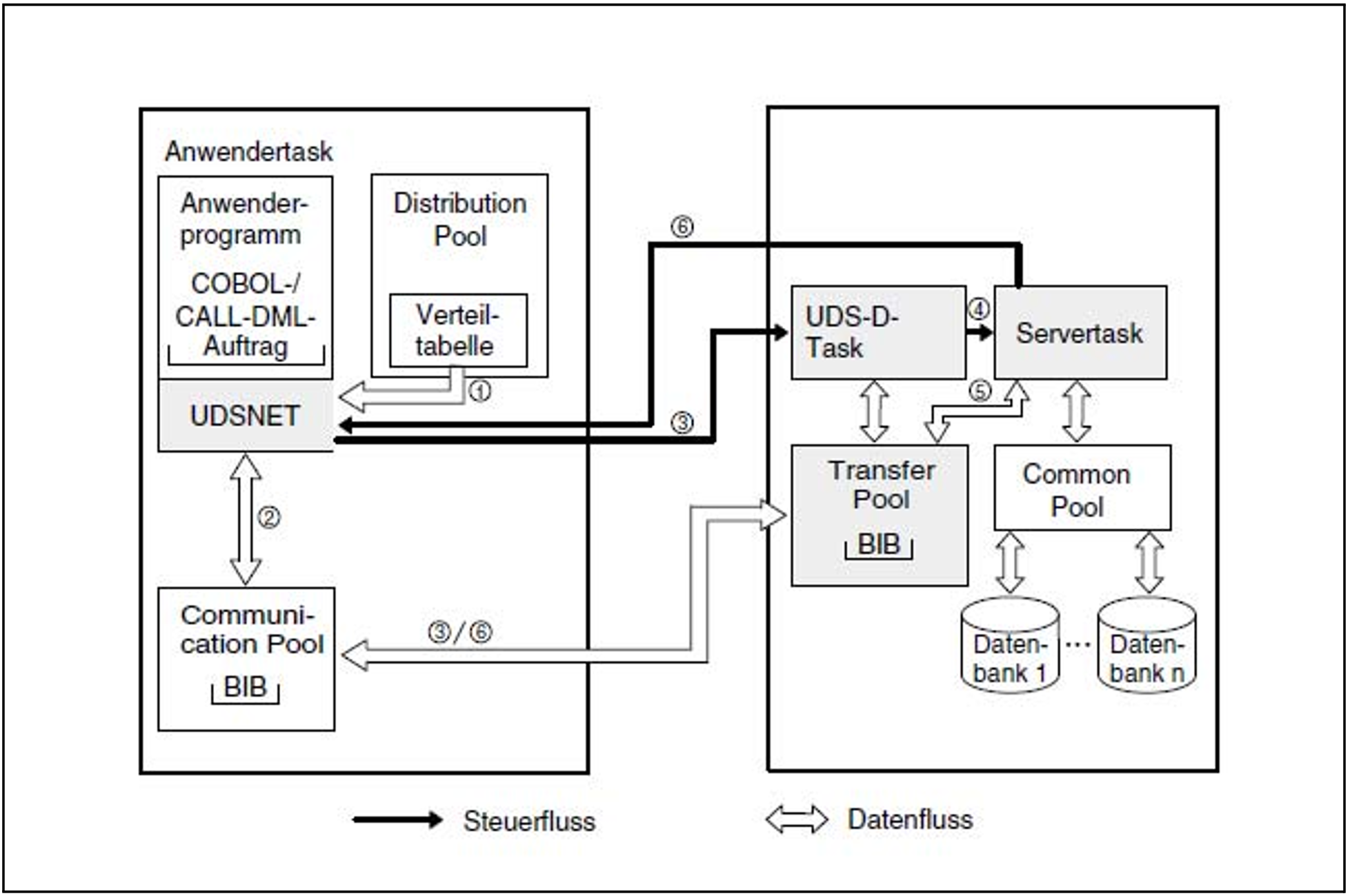 Aus dem Communication Pool wird der BIB über die logische Verbindung in den Transfer Pool übertragen. Dadurch wird die entfernte UDS-D-Task geweckt. Die Anwendertask selbst wartet auf das Eintreffen des bearbeiteten BIBs.