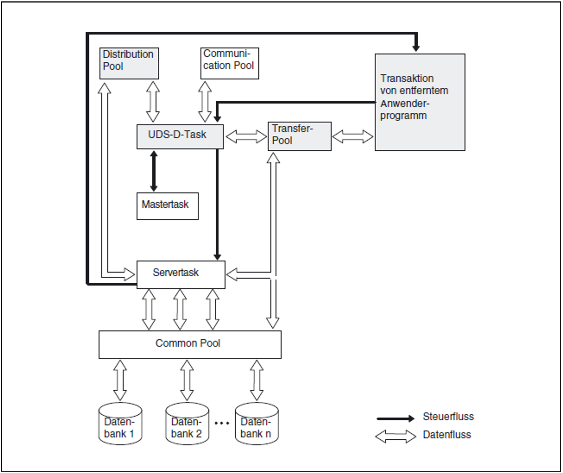 Die UDS-D-Task richtet UDS-D-spezifische Tabellen und Speicherbereiche ein, z.B. den Distribution Pool mit der Verteiltabelle und den Transfer Pool zur Aufnahme von BIBs. Sie empfängt DML-Anweisungen von entfernten Anwenderprogrammen und reicht sie an eine Servertask weiter.