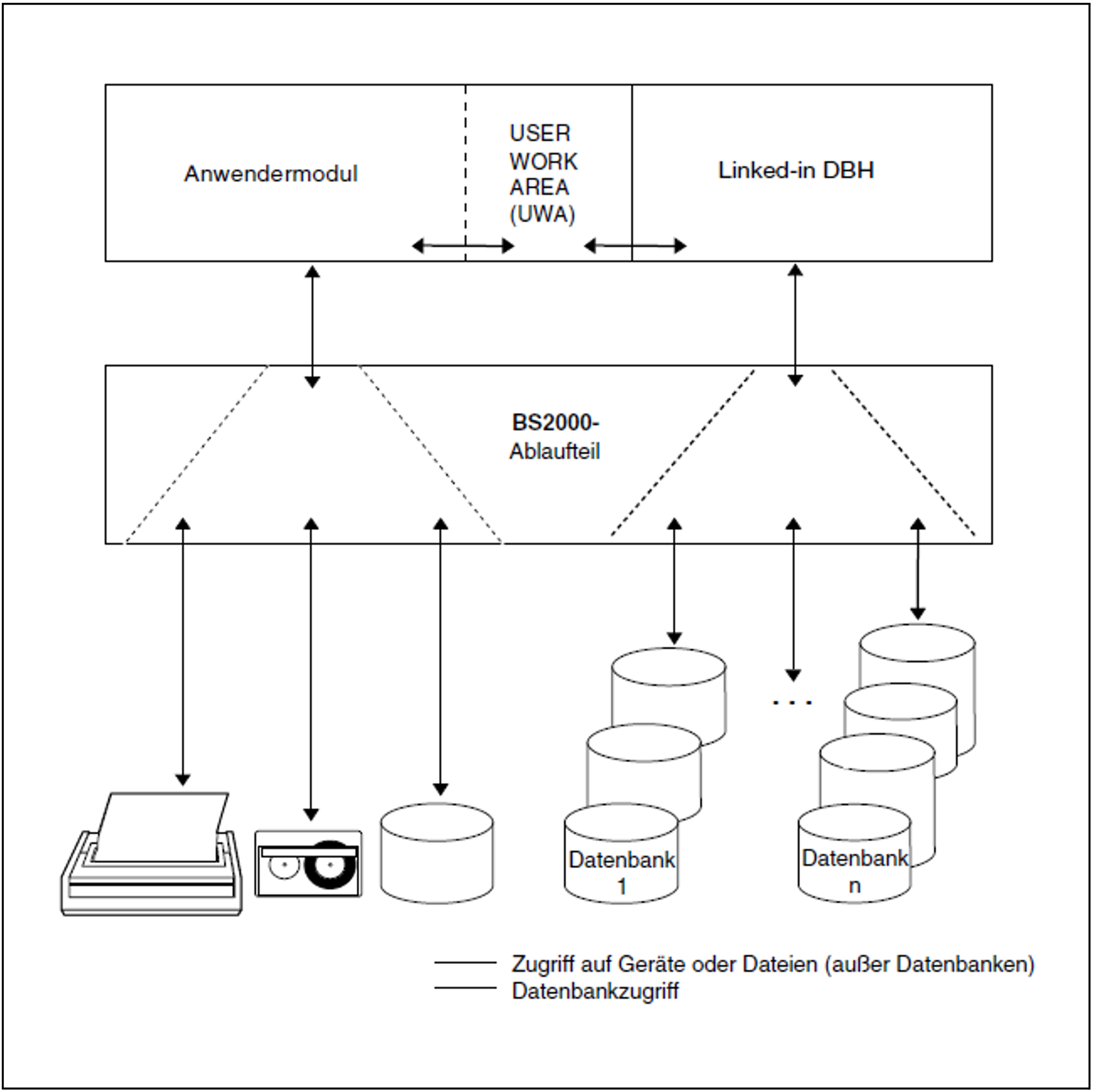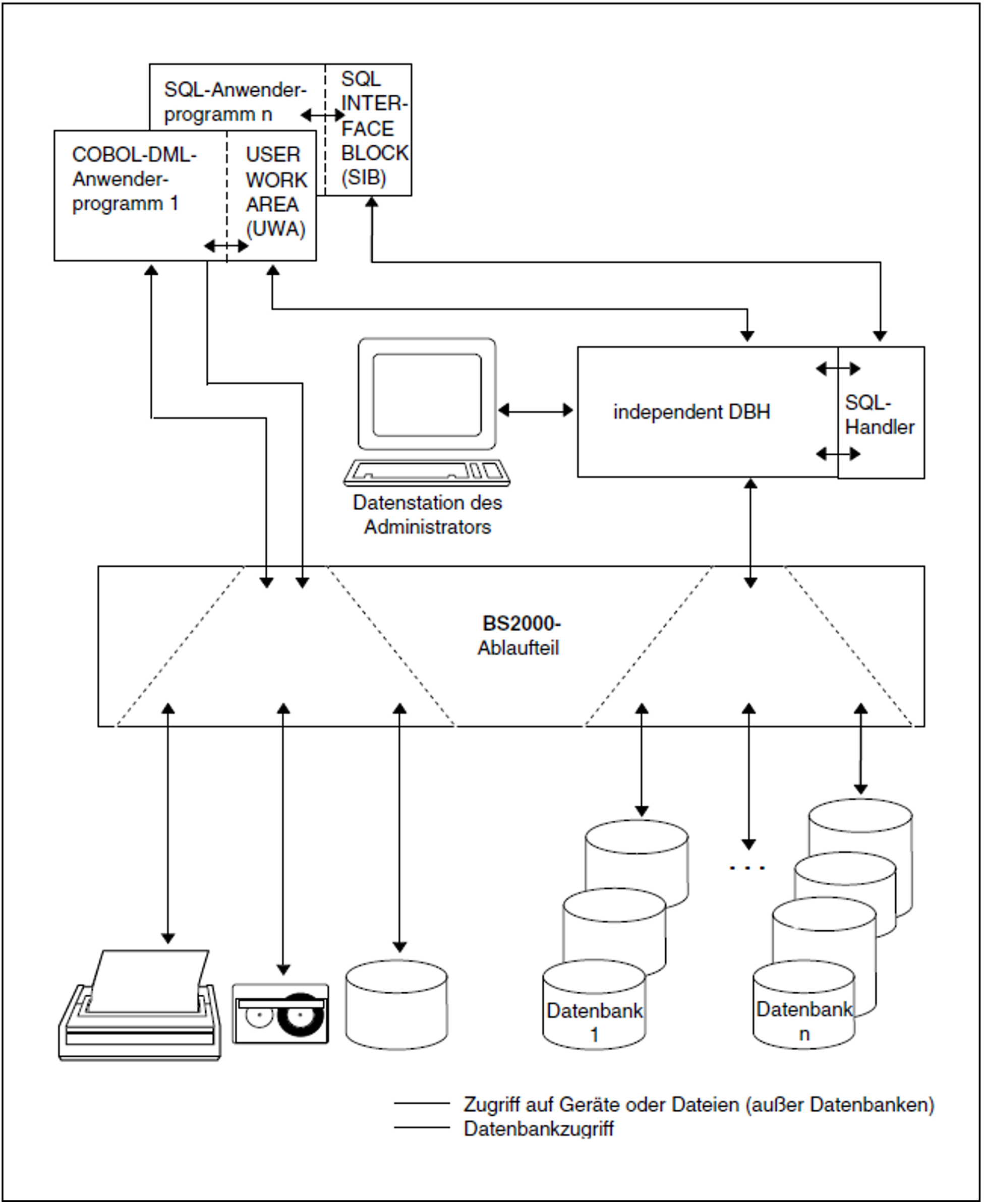 Auf eine UDS/SQL-Datenbank kann das Datenbank-Anwenderprogramm nicht direkt zugreifen, wie z.B. auf die Daten einer einfachen Datei. Vielmehr steuert der Database Handler (DBH) den Zugriff auf die Datenbank und nimmt dem Anwenderprogramm damit auch alle Verwaltungsarbeiten ab, die z.B. beim Speichern von Daten anfallen.