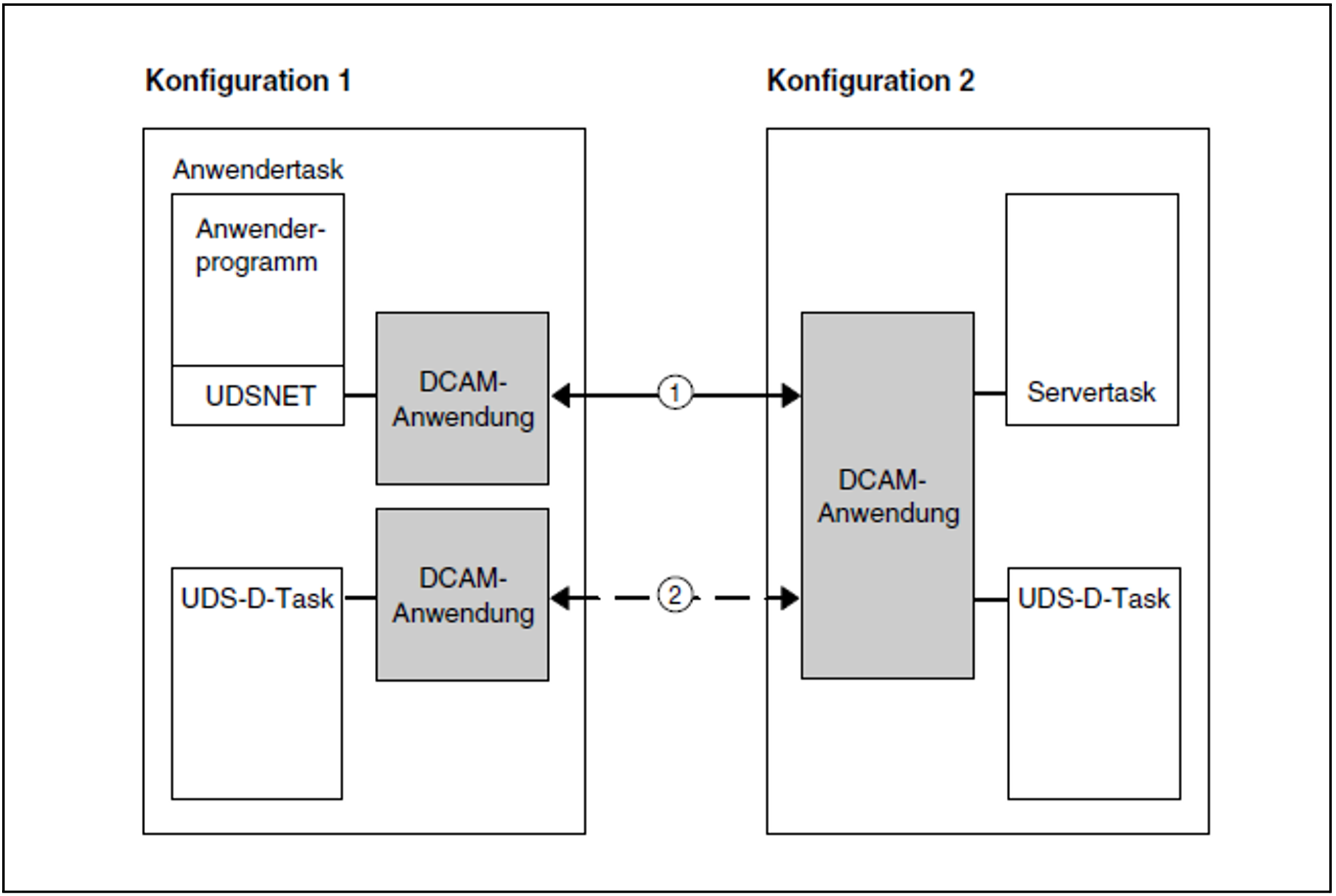 Die Kommunikation zwischen zwei Konfigurationen findet statt durch DCAM-Anwendungen, die über logische Verbindungen miteinander verkehren. Das gilt auch, wenn die Konfigurationen im gleichen Verarbeitungsrechner liegen.