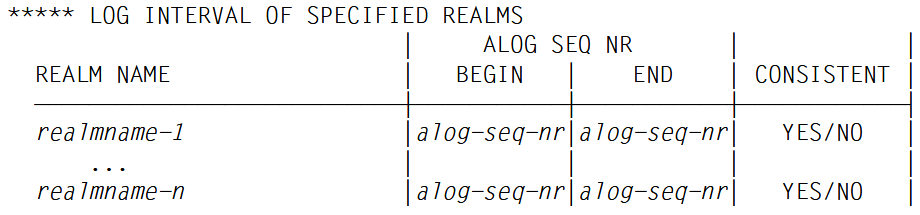 (2) Auflistung der spezifizierten Realms mit Angabe der ALOG SEQ NR (z.B. unterschiedlich bei Sicherungsbeginn oder bei Sicherungsende einer Online-Sicherung)