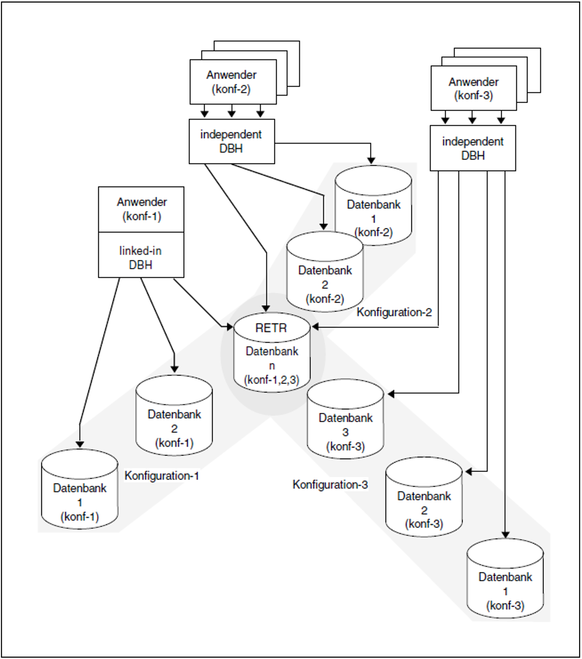 Dabei ist es auch möglich, den DBH unter einer Kennung mehrmals für verschiedene Datenbanken bzw. DB-Konfigurationen zu laden und eine Datenbank von mehreren parallel laufenden DBHs lesend, d.h. mit der Angabe SHARED-RETRIEVAL im Ladeparameter PP DBNAME bzw. im DAL-Kommando ADD DB, anzusprechen. Dies gilt auch für Schattendatenbanken.