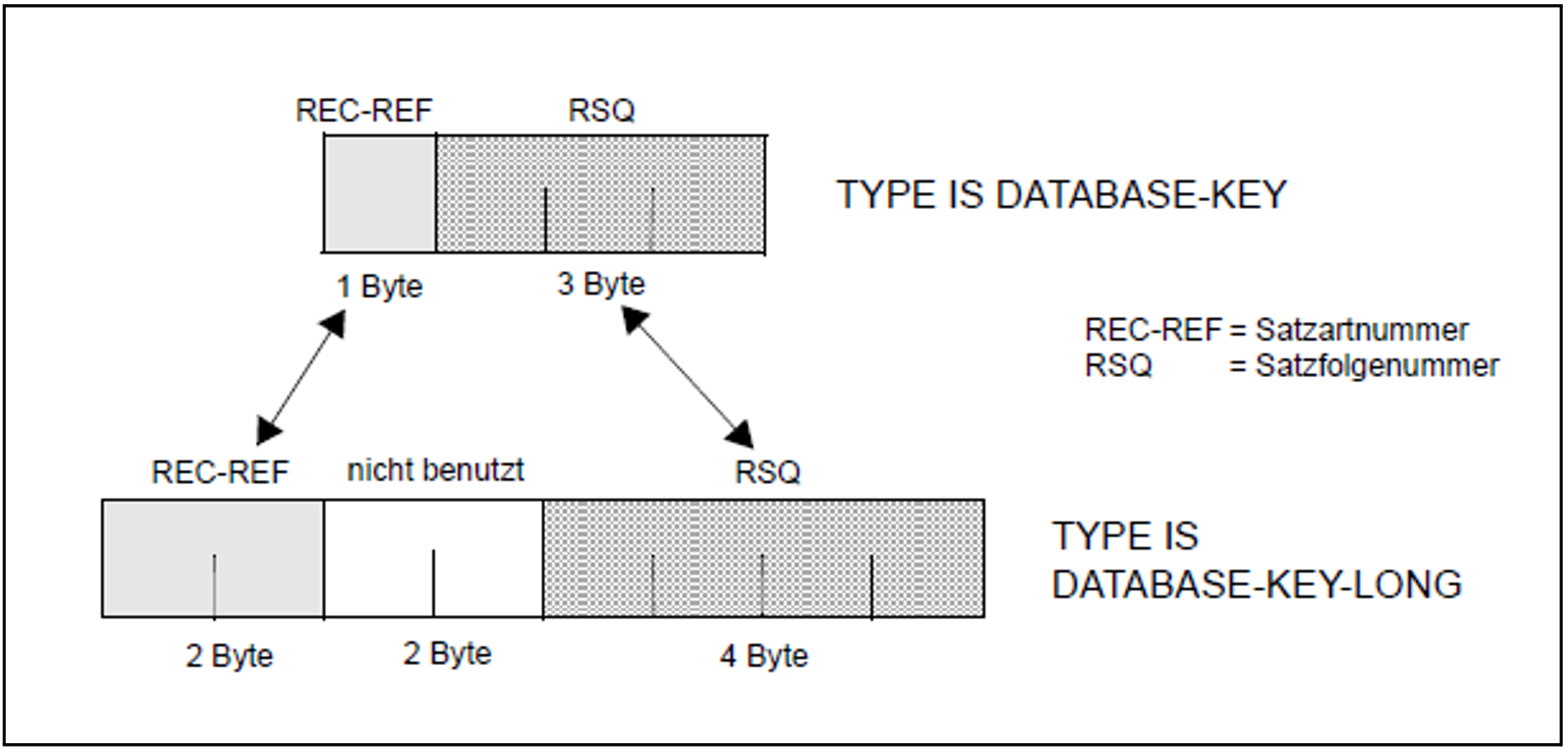 BALTER überträgt die 1 Byte lange Satzartnummer (REC-REF) des DATABASE-KEY-Feldes rechtsbündig in den entsprechenden 2 Byte langen Bereich des DATABASE-KEY-LONG-Feldes. Die 3 Byte lange Satzfolgenummer (RSQ) des DATABASE-KEY-Feldes wird rechtsbündig in den entsprechenden 4 Byte langen Bereich des DATABASE-KEY-LONG-Feldes übertragen.TYPE IS DATABASE-KEY-LONG