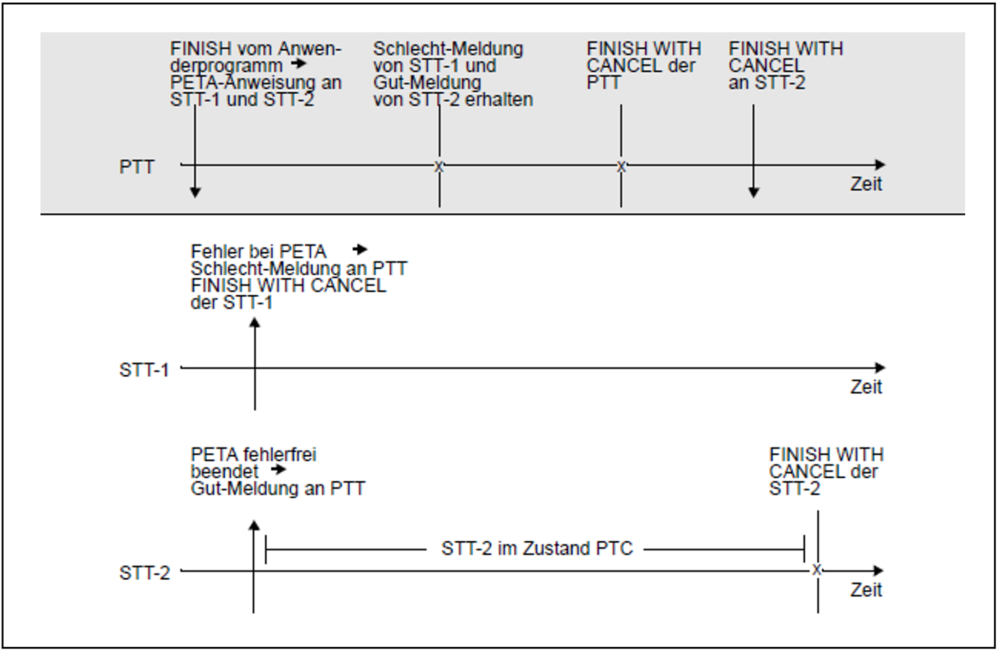 Eine Teiltransaktion befindet sich im Zustand PTC (Prepared to Commit), wenn sie die PETA-Anweisung erfolgreich durchgeführt, aber noch keinen Auftrag zur Beendigung der Transaktion erhalten hat. Im Zustand PTC ist noch nicht entschieden, ob die gesamte Transaktion - also auch die Teiltransaktion selbst - mit FINISH oder mit FINISH WITH CANCEL beendet wird.